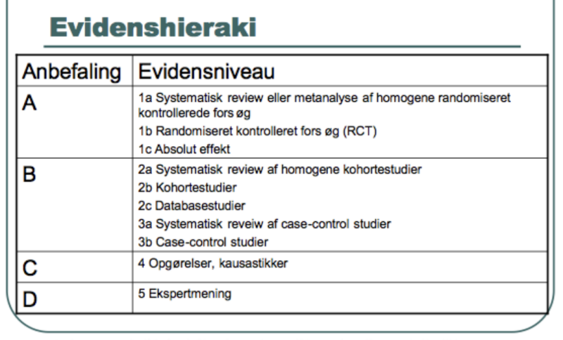 Nederst i evidenshierarkiet finder vi ekspertvurderinger, klinisk erfaring og individuelle erfaringer.