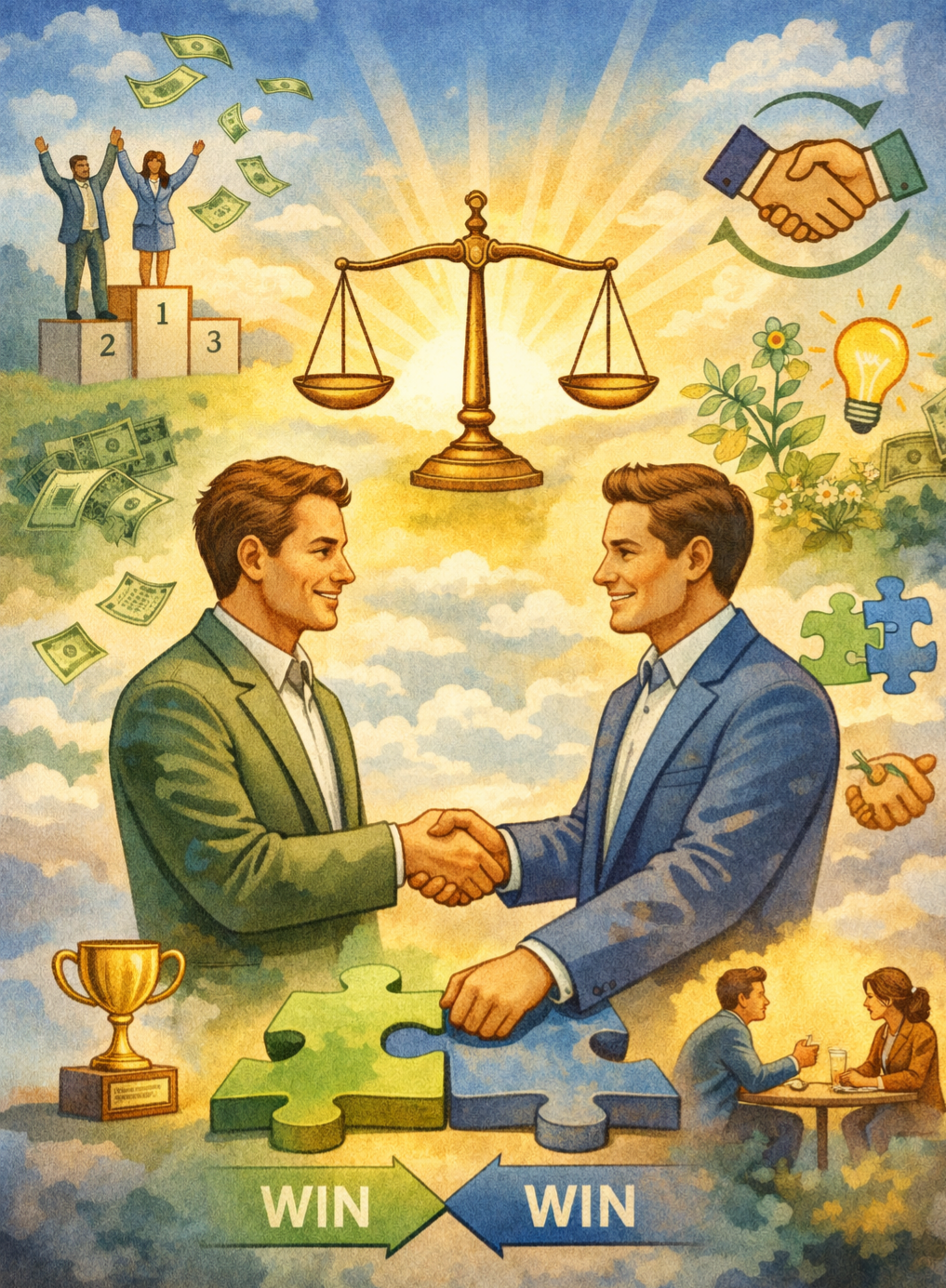 Dvs. vi kan finde relationer, hvor vi kan dele viden, anerkendelse, kreative løsninger og gevinst med andre. Ved fælles hjælp kan man måske endda udvide mængden af ressourcer tilgængelige for begge parter.