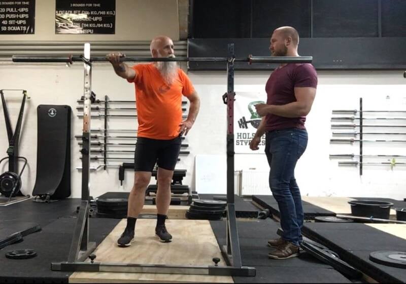 Udfør fem gentagelser. Føles vægten let, øges belastningen en smule. Gentag denne proces, indtil vægten opleves som moderat udfordrende uden at gå på kompromis med teknikken. Denne vægt udgør din startvægt. Herefter udføres yderligere to sæt af fem gentagelser, med 3-5 minutters pause mellem hvert sæt. Ved efterfølgende træningspas øges vægten med 2,5 kg samlet (1,25 kg på hver side af stangen), og der arbejdes videre med tre sæt af fem gentagelser.