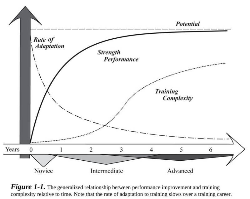 Den hurtigste stigning i både muskelmasse og styrke finder sted under nybegynderfasen. Derfor er det afgørende at udnytte denne periode fuldt ud og fastholde status som nybegynder så længe som muligt. Efterhånden som træningen bliver mere avanceret, kræves en betydeligt højere træningsstress for at fremkalde fortsat fremgang — samtidig med, at hastigheden af den målbare udvikling gradvist falder.